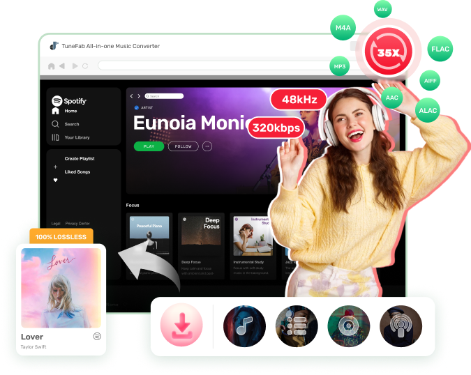 O TuneFab Spotify Music Converter permite que os usuários do Spotify gratuito e do Spotify Premium convertam e baixem rapidamente qualquer tipo de conteúdo de áudio do Spotify: